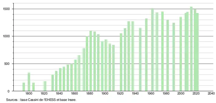L'évolution du nombre d'habitants est connue à travers les recensements de la population effectués dans la commune depuis 1793. Pour les communes de moins de 10 000 habitants, une enquête de recensement portant sur toute la population est réalisée tous les cinq ans, les populations légales des années intermédiaires étant quant à elles estimées par interpolation ou extrapolation[22]. Pour la commune, le premier recensement exhaustif entrant dans le cadre du nouveau dispositif a été réalisé en 2008[23].