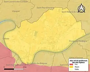 Le retrait-gonflement des sols argileux est susceptible d'engendrer des dommages importants aux bâtiments en cas d’alternance de périodes de sécheresse et de pluie. 99,9 % de la superficie communale est en aléa moyen ou fort (67,4 % au niveau départemental et 48,5 % au niveau national). Sur les 898 bâtiments dénombrés sur la commune en 2019, 898 sont en aléa moyen ou fort, soit 100 %, à comparer aux 84 % au niveau départemental et 54 % au niveau national. Une cartographie de l'exposition du territoire national au retrait gonflement des sols argileux est disponible sur le site du BRGM[27],[Carte 2].