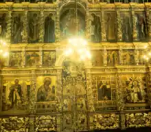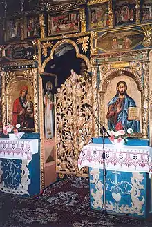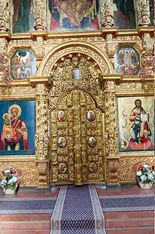 Dans certaines églises, un panneau coulissant, représentant le Christ en majesté, se substitue aux Saintes Portes et au Voile, et, dans certaines églises, il n'y a même aucune barrière physique[4].