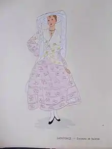 En 1835, hommes et femmes portent encore la « cape », espèce de petit manteau à capuchon si célèbre chez les Romains sous le nom de bardo-cucullus ou cucullus santonicus. Ce vêtement commode, qui avait été adopté par plusieurs autres peuples de la Gaule, se retrouve encore chez les habitants des Landes à l'époque[2]. À la fin des années 1860, les hommes saintongeais empruntent souvent à leurs femmes la « cape » ou « cucule » qui est saintongeaise de toute antiquité. Ils portent aussi la chaussure en bois de leurs ancêtres, la « galoche » (gallica) et encore quelque peu le grand chapeau analogue au sombrero des Espagnols[3]. Pour ce qui est de la ganse en chenille multicolore, du vieil habit à la Henri IV, du hauts-de-chausses à jarretières rouges et à gabillots au lieu de boutons, ils ont totalement disparu en 1869[3].
