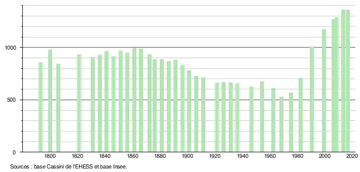 L'évolution du nombre d'habitants est connue à travers les recensements de la population effectués dans la commune depuis 1793. Pour les communes de moins de 10 000 habitants, une enquête de recensement portant sur toute la population est réalisée tous les cinq ans, les populations légales des années intermédiaires étant quant à elles estimées par interpolation ou extrapolation[21]. Pour la commune, le premier recensement exhaustif entrant dans le cadre du nouveau dispositif a été réalisé en 2008[22].