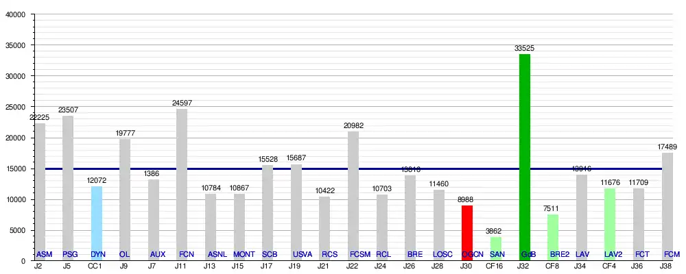344 249 spectateurs ont assisté à une rencontre au stade cette saison, soit une moyenne de 14 967 par match. La moyenne chute de 5 000 personnes par rapport à la saison précédente.