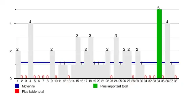 | Journée | 20 | 21 | 22 | 23 | 24 | 25 | 26 | 27 | 28 | 29 | 30 | 31 | 32 | 33 | 34 | 35 | 36 | 37 | 38 |
