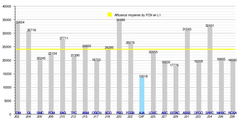 - de 466 626 spectateurs en 19 rencontres de Ligue 1, soit une moyenne de 24 559/match.