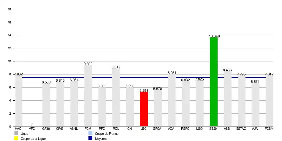 Le match du contre Valenciennes n'est pas comptabilisé dans la moyenne car délocalisé au Stade Matmut-Atlantique de Bordeaux et joué à huis clos en raison du très mauvais état de la pelouse du Moustoir causé par le spectacle des Nuits interceltiques du Festival interceltique[15].