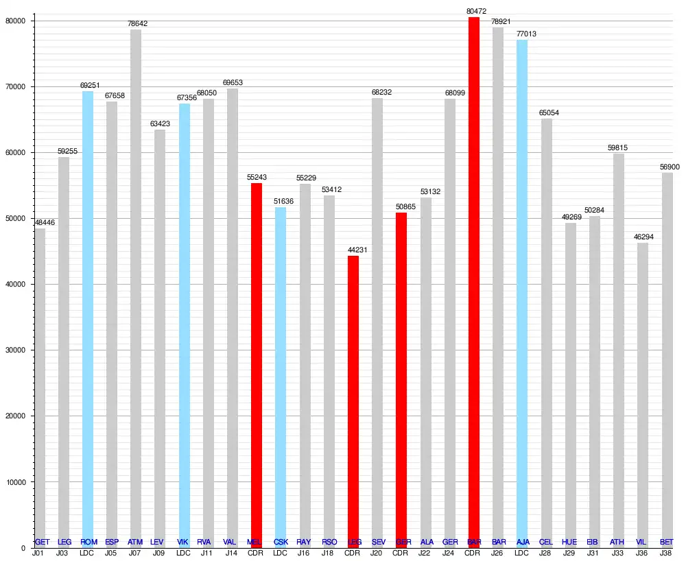 - 47 % lors de la 10e journée de Liga (FC Barcelone - Real Madrid, 5-1)