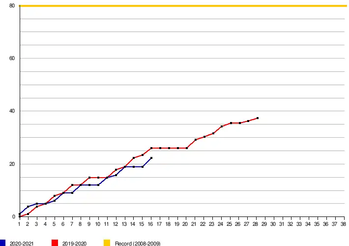 | Buts encaissés | 2 | 5 | 2 | 0 | 5 | 3 | 0 | 0 | 0 | 17 |