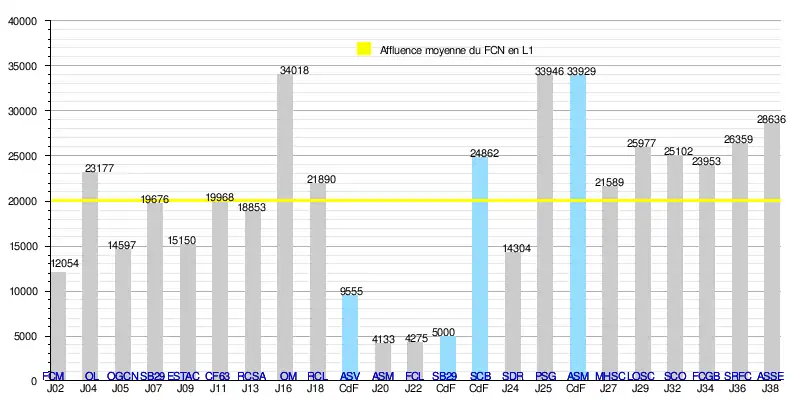 - de 387 657 spectateurs en 19 rencontres de Ligue 1, soit une moyenne de 20 403/match.