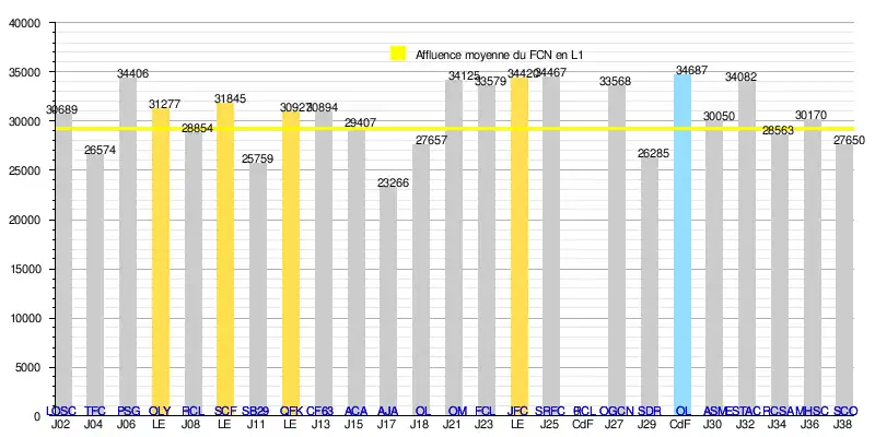 - de 570 045 spectateurs en 19 rencontres de Ligue 1, soit une moyenne de 30 002/match.