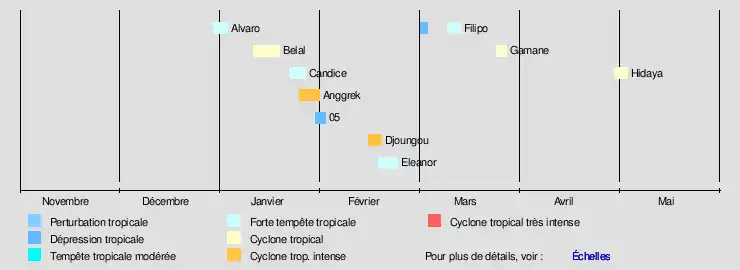 La saison a débuté tardivement avec Alvaro qui s'est formé le dans le canal du Mozambique, atteignant le stade de forte tempête tropicale et causant 19 décès en traversant le sud de Madagascar avant de se dissiper dans l'océan Indien au début janvier. Ensuite, la plupart des systèmes ont affecté la région entre Madagascar et les Mascareignes, les cyclones Belal, Filipo et Gamane causant des dégâts et au moins 27 pertes de vies supplémentaires. Heureusement, les systèmes les plus intenses sont passés sur l'extrême Est du bassin, au milieu de nul part