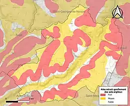 Les mouvements de terrains susceptibles de se produire sur la commune sont des tassements différentiels[18]. Le retrait-gonflement des sols argileux est susceptible d'engendrer des dommages importants aux bâtiments en cas d’alternance de périodes de sécheresse et de pluie[19]. 88,6 % de la superficie communale est en aléa moyen ou fort (54,9 % au niveau départemental et 48,5 % au niveau national)[Carte 2]. Depuis le , en application de la loi ELAN, différentes contraintes s'imposent aux vendeurs, maîtres d'ouvrages ou constructeurs de biens situés dans une zone classée en aléa moyen ou fort[Note 3],[20].