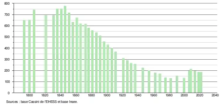 L'évolution du nombre d'habitants est connue à travers les recensements de la population effectués dans la commune depuis 1793. Pour les communes de moins de 10 000 habitants, une enquête de recensement portant sur toute la population est réalisée tous les cinq ans, les populations légales des années intermédiaires étant quant à elles estimées par interpolation ou extrapolation[15]. Pour la commune, le premier recensement exhaustif entrant dans le cadre du nouveau dispositif a été réalisé en 2008[16].