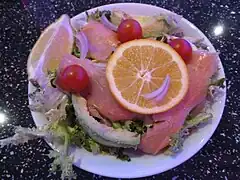 Salade californienne, avec salade, tomate, avocat, saumon, crevette, orange, vinaigrette. | |