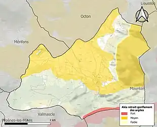 Le retrait-gonflement des sols argileux est susceptible d'engendrer des dommages importants aux bâtiments en cas d’alternance de périodes de sécheresse et de pluie. 51,9 % de la superficie communale est en aléa moyen ou fort (59,3 % au niveau départemental et 48,5 % au niveau national). Sur les 213 bâtiments dénombrés sur la commune en 2019, 153 sont en aléa moyen ou fort, soit 72 %, à comparer aux 85 % au niveau départemental et 54 % au niveau national. Une cartographie de l'exposition du territoire national au retrait gonflement des sols argileux est disponible sur le site du BRGM[23],[Carte 2].