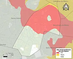 Le retrait-gonflement des sols argileux est susceptible d'engendrer des dommages importants aux bâtiments en cas d’alternance de périodes de sécheresse et de pluie. 51,7 % de la superficie communale est en aléa moyen ou fort (67,4 % au niveau départemental et 48,5 % au niveau national). Sur les 404 bâtiments dénombrés sur la commune en 2019, 402 sont en aléa moyen ou fort, soit 100 %, à comparer aux 84 % au niveau départemental et 54 % au niveau national. Une cartographie de l'exposition du territoire national au retrait gonflement des sols argileux est disponible sur le site du BRGM[20],[Carte 2].