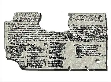 Ce bronze raconte les mérites de la TVRMA SALLVITANA dans la prise d'Ascoli durant la guerre sociale (vers 90 av. J.-C.) et il donne une liste de ses effectifs, qui reçurent comme prix la citoyenneté romaine. Ils sont les premiers pérégrins auxquels cet honneur est accordé.