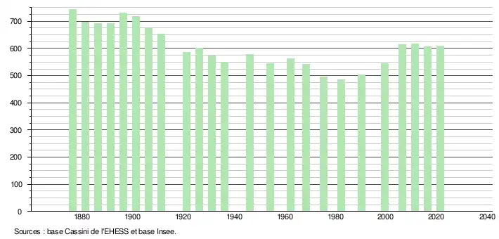 L'évolution du nombre d'habitants est connue à travers les recensements de la population effectués dans la commune depuis 1876. Pour les communes de moins de 10 000 habitants, une enquête de recensement portant sur toute la population est réalisée tous les cinq ans, les populations légales des années intermédiaires étant quant à elles estimées par interpolation ou extrapolation[19]. Pour la commune, le premier recensement exhaustif entrant dans le cadre du nouveau dispositif a été réalisé en 2006[20].