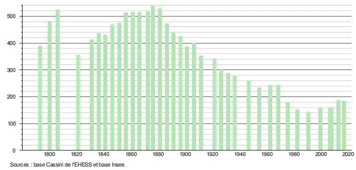 L'évolution du nombre d'habitants est connue à travers les recensements de la population effectués dans la commune depuis 1793. Pour les communes de moins de 10 000 habitants, une enquête de recensement portant sur toute la population est réalisée tous les cinq ans, les populations légales des années intermédiaires étant quant à elles estimées par interpolation ou extrapolation[4]. Pour la commune, le premier recensement exhaustif entrant dans le cadre du nouveau dispositif a été réalisé en 2007[5].