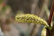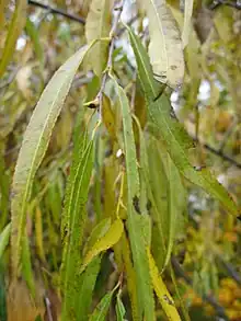 C'est un buisson aux feuilles caduques atteignant jusqu'à 5 m de haut. Les feuilles sont fines, lancéolées, longues de 6 à 10 cm et larges de 0,8 à 2 cm, d'un vert sombre et brillant sur la face supérieure, glauques et légèrement velues au-dessous, avec une bordure dentée. Les fleurs apparaissent au début du printemps, ce sont des chatons de 2 à 3 cm de long[3].