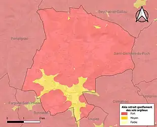 Le retrait-gonflement des sols argileux est susceptible d'engendrer des dommages importants aux bâtiments en cas d’alternance de périodes de sécheresse et de pluie. La totalité de la commune est en aléa moyen ou fort (67,4 % au niveau départemental et 48,5 % au niveau national). Sur les 1 025 bâtiments dénombrés sur la commune en 2019, 1 025 sont en aléa moyen ou fort, soit 100 %, à comparer aux 84 % au niveau départemental et 54 % au niveau national. Une cartographie de l'exposition du territoire national au retrait gonflement des sols argileux est disponible sur le site du BRGM[20],[Carte 2].