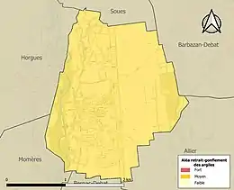 Le retrait-gonflement des sols argileux est susceptible d'engendrer des dommages importants aux bâtiments en cas d’alternance de périodes de sécheresse et de pluie. La totalité de la commune est en aléa moyen ou fort (44,5 % au niveau départemental et 48,5 % au niveau national). Sur les 246 bâtiments dénombrés sur la commune en 2019, 246 sont en aléa moyen ou fort, soit 100 %, à comparer aux 75 % au niveau départemental et 54 % au niveau national. Une cartographie de l'exposition du territoire national au retrait gonflement des sols argileux est disponible sur le site du BRGM[28],[Carte 3].