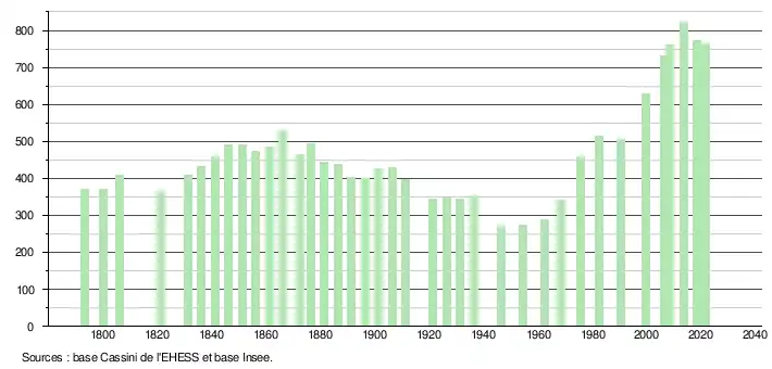 L'évolution du nombre d'habitants est connue à travers les recensements de la population effectués dans la commune depuis 1793. Pour les communes de moins de 10 000 habitants, une enquête de recensement portant sur toute la population est réalisée tous les cinq ans, les populations légales des années intermédiaires étant quant à elles estimées par interpolation ou extrapolation[19]. Pour la commune, le premier recensement exhaustif entrant dans le cadre du nouveau dispositif a été réalisé en 2008[20].