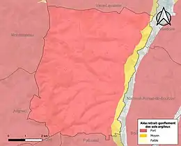 Le retrait-gonflement des sols argileux est susceptible d'engendrer des dommages importants aux bâtiments en cas d’alternance de périodes de sécheresse et de pluie. 99,8 % de la superficie communale est en aléa moyen ou fort (67,4 % au niveau départemental et 48,5 % au niveau national). Sur les 264 bâtiments dénombrés sur la commune en 2019, 264 sont en aléa moyen ou fort, soit 100 %, à comparer aux 81 % au niveau départemental et 54 % au niveau national. Une cartographie de l'exposition du territoire national au retrait gonflement des sols argileux est disponible sur le site du BRGM[27],[Carte 3].