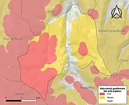 Les mouvements de terrains susceptibles de se produire sur la commune sont des tassements différentiels[40]. Le retrait-gonflement des sols argileux est susceptible d'engendrer des dommages importants aux bâtiments en cas d’alternance de périodes de sécheresse et de pluie[41]. 88,3 % de la superficie communale est en aléa moyen ou fort (58,6 % au niveau départemental et 48,5 % au niveau national métropolitain)[Carte 4]. Depuis le , en application de la loi ÉLAN, différentes contraintes s'imposent aux vendeurs, maîtres d'ouvrages ou constructeurs de biens situés dans une zone classée en aléa moyen ou fort[Note 4],[42].
