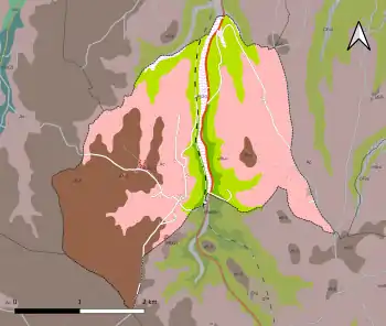 L'occupation des sols de la commune, telle qu'elle ressort de la base de données européenne d’occupation biophysique des sols Corine Land Cover (CLC), est marquée par l'importance des forêts et milieux semi-naturels (81,3 % en 2018), néanmoins en diminution par rapport à 1990 (82,7 %). La répartition détaillée en 2018 est la suivante : forêts (81,3 %), zones agricoles hétérogènes (18,7 %)[33]. L'évolution de l’occupation des sols de la commune et de ses infrastructures peut être observée sur les différentes représentations cartographiques du territoire : la carte de Cassini (XVIIIe siècle), la carte d'état-major (1820-1866) et les cartes ou photos aériennes de l'IGN pour la période actuelle (1950 à aujourd'hui)[Carte 3].