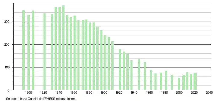 L'évolution du nombre d'habitants est connue à travers les recensements de la population effectués dans la commune depuis 1793. Pour les communes de moins de 10 000 habitants, une enquête de recensement portant sur toute la population est réalisée tous les cinq ans, les populations légales des années intermédiaires étant quant à elles estimées par interpolation ou extrapolation[48]. Pour la commune, le premier recensement exhaustif entrant dans le cadre du nouveau dispositif a été réalisé en 2005[49].