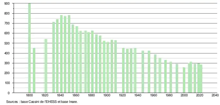 | L'évolution du nombre d'habitants est connue à travers les recensements de la population effectués dans la commune depuis 1800. Pour les communes de moins de 10 000 habitants, une enquête de recensement portant sur toute la population est réalisée tous les cinq ans, les populations légales des années intermédiaires étant quant à elles estimées par interpolation ou extrapolation[25]. Pour la commune, le premier recensement exhaustif entrant dans le cadre du nouveau dispositif a été réalisé en 2008[26]. En 2021, la commune comptait 285 habitants[Note 4], en diminution de 1,04 % par rapport à 2015 (Lot-et-Garonne : −0,66 %, France hors Mayotte : +1,84 %). |