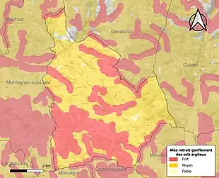 Le retrait-gonflement des sols argileux est susceptible d'engendrer des dommages importants aux bâtiments en cas d’alternance de périodes de sécheresse et de pluie[21]. 98,6 % de la superficie communale est en aléa moyen ou fort (91,8 % au niveau départemental et 48,5 % au niveau national)[Carte 2]. Depuis le , en application de la loi ELAN, différentes contraintes s'imposent aux vendeurs, maîtres d'ouvrages ou constructeurs de biens situés dans une zone classée en aléa moyen ou fort[Note 3],[22].