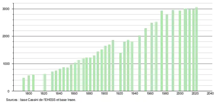 L'évolution du nombre d'habitants est connue à travers les recensements de la population effectués dans la commune depuis 1793. Pour les communes de moins de 10 000 habitants, une enquête de recensement portant sur toute la population est réalisée tous les cinq ans, les populations légales des années intermédiaires étant quant à elles estimées par interpolation ou extrapolation[37]. Pour la commune, le premier recensement exhaustif entrant dans le cadre du nouveau dispositif a été réalisé en 2007[38].