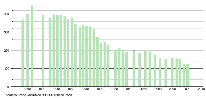 L'évolution du nombre d'habitants est connue à travers les recensements de la population effectués dans la commune depuis 1793. Pour les communes de moins de 10 000 habitants, une enquête de recensement portant sur toute la population est réalisée tous les cinq ans, les populations légales des années intermédiaires étant quant à elles estimées par interpolation ou extrapolation[17]. Pour la commune, le premier recensement exhaustif entrant dans le cadre du nouveau dispositif a été réalisé en 2005[18].