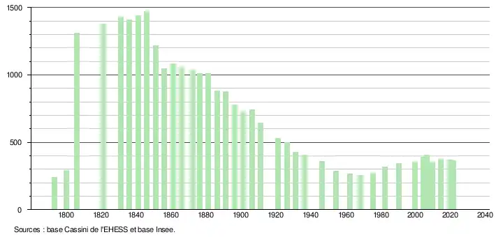 L'évolution du nombre d'habitants est connue à travers les recensements de la population effectués dans la commune depuis 1793. Pour les communes de moins de 10 000 habitants, une enquête de recensement portant sur toute la population est réalisée tous les cinq ans, les populations légales des années intermédiaires étant quant à elles estimées par interpolation ou extrapolation[42]. Pour la commune, le premier recensement exhaustif entrant dans le cadre du nouveau dispositif a été réalisé en 2004[43].