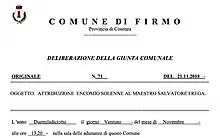 21 novembre 2018 - Mention solennelle pour sa carrière, qui lui a été décernée par la municipalité de Firmo et la région de Calabre, en Italie .