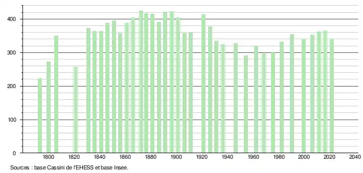 L'évolution du nombre d'habitants est connue à travers les recensements de la population effectués dans la commune depuis 1793. Pour les communes de moins de 10 000 habitants, une enquête de recensement portant sur toute la population est réalisée tous les cinq ans, les populations légales des années intermédiaires étant quant à elles estimées par interpolation ou extrapolation[18]. Pour la commune, le premier recensement exhaustif entrant dans le cadre du nouveau dispositif a été réalisé en 2006[19].