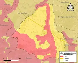 Le retrait-gonflement des sols argileux est susceptible d'engendrer des dommages importants aux bâtiments en cas d’alternance de périodes de sécheresse et de pluie[19]. La totalité de la commune est en aléa moyen ou fort (91,8 % au niveau départemental et 48,5 % au niveau national)[Carte 2]. Depuis le , en application de la loi ELAN, différentes contraintes s'imposent aux vendeurs, maîtres d'ouvrages ou constructeurs de biens situés dans une zone classée en aléa moyen ou fort[Note 3],[20].