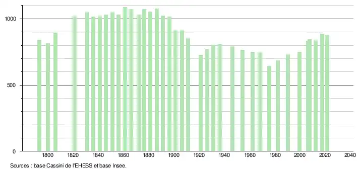 L'évolution du nombre d'habitants est connue à travers les recensements de la population effectués dans la commune depuis 1793. Pour les communes de moins de 10 000 habitants, une enquête de recensement portant sur toute la population est réalisée tous les cinq ans, les populations légales des années intermédiaires étant quant à elles estimées par interpolation ou extrapolation[23]. Pour la commune, le premier recensement exhaustif entrant dans le cadre du nouveau dispositif a été réalisé en 2007[24].