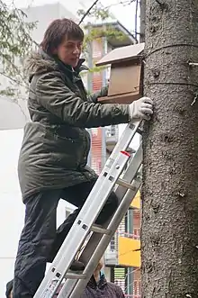 La femme politique russe Galina Chirshina accroche un nichoir lors d’un soubbotnik (indiqué « journée de travail communautaire ») dans une forêt préservée à Petrozavodsk, avril 2015 - Le , 400 000 habitants de la région de Primorié auraient participé à un soubbotnik[19].