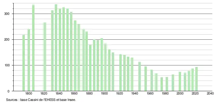 L'évolution du nombre d'habitants est connue à travers les recensements de la population effectués dans la commune depuis 1793. Pour les communes de moins de 10 000 habitants, une enquête de recensement portant sur toute la population est réalisée tous les cinq ans, les populations légales des années intermédiaires étant quant à elles estimées par interpolation ou extrapolation[45]. Pour la commune, le premier recensement exhaustif entrant dans le cadre du nouveau dispositif a été réalisé en 2006[46].