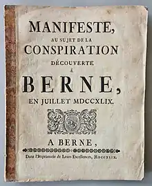 L’exécution du plan des conjurés était fixée au . Leur nombre s’élevait déjà à soixante, lorsque Henzi songea à s’éloigner d’eux, prévoyant que leur perversité, leur imprudence et leur manque d’accord finiraient par les trahir. Au moment où il se disposait à fuir, il fut saisi et jeté en prison avec deux de ses complices. Les autres s’échappèrent, et le bruit des violences qu’ils complotaient ne tarda pas à s’exagérer.