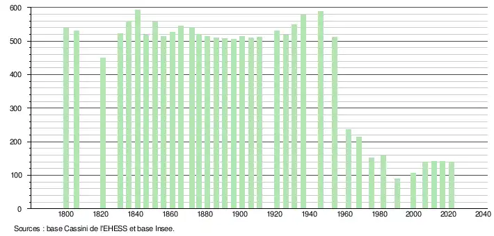L'évolution du nombre d'habitants est connue à travers les recensements de la population effectués dans la commune depuis 1800. Pour les communes de moins de 10 000 habitants, une enquête de recensement portant sur toute la population est réalisée tous les cinq ans, les populations légales des années intermédiaires étant quant à elles estimées par interpolation ou extrapolation[13]. Pour la commune, le premier recensement exhaustif entrant dans le cadre du nouveau dispositif a été réalisé en 2006[14].