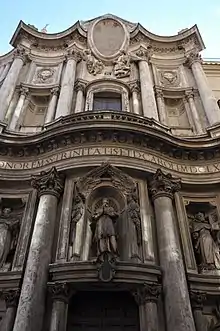 Borromini élabora sa façade sur deux niveaux. La partie inférieure est caractérisée par une succession de surfaces, concave, convexe, concave, alors que le niveau supérieur présente trois parties concaves dont la centrale supporte un édicule convexe. Cette alternance rythmique des formes crée une façade dynamique pleine de mouvement, agrémentée d’une magnifique décoration, comme la niche au-dessus de la porte dans laquelle se trouve la statue de saint Charles Borromée encadrée par deux anges dont les ailes lui procurent un abri, et le médaillon ovale et concave placé à la partie supérieure que supportent deux anges, il fut un temps où il était décoré de l’image de saint Charles.