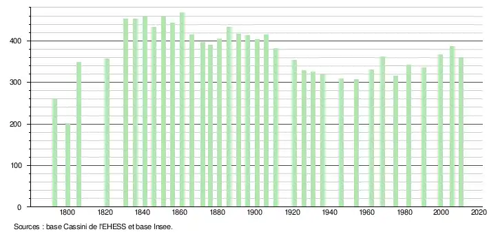L'évolution du nombre d'habitants est connue à travers les recensements de la population effectués dans la commune depuis 1793. À partir du , les populations légales des communes sont publiées annuellement dans le cadre d'un recensement qui repose désormais sur une collecte d'information annuelle, concernant successivement tous les territoires communaux au cours d'une période de cinq ans. Pour les communes de moins de 10 000 habitants, une enquête de recensement portant sur toute la population est réalisée tous les cinq ans, les populations légales des années intermédiaires étant quant à elles estimées par interpolation ou extrapolation[3]. Pour la commune, le premier recensement exhaustif entrant dans le cadre du nouveau dispositif a été réalisé en 2005[4],[Note 1].
