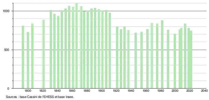 L'évolution du nombre d'habitants est connue à travers les recensements de la population effectués dans la commune depuis 1793. Pour les communes de moins de 10 000 habitants, une enquête de recensement portant sur toute la population est réalisée tous les cinq ans, les populations légales des années intermédiaires étant quant à elles estimées par interpolation ou extrapolation[27]. Pour la commune, le premier recensement exhaustif entrant dans le cadre du nouveau dispositif a été réalisé en 2008[28].