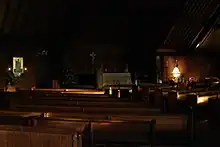 - Enfin, la grande chapelle de la Réconciliation ferme l'espace du sanctuaire et le sépare du parking réservé aux visiteurs[12],[N 4].