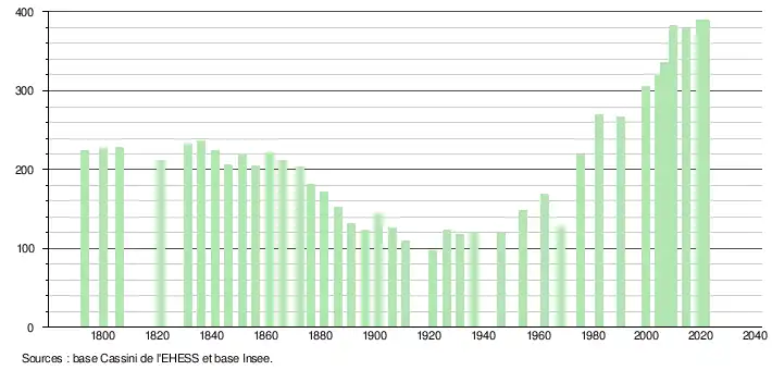 L'évolution du nombre d'habitants est connue à travers les recensements de la population effectués dans la commune depuis 1793. Pour les communes de moins de 10 000 habitants, une enquête de recensement portant sur toute la population est réalisée tous les cinq ans, les populations légales des années intermédiaires étant quant à elles estimées par interpolation ou extrapolation[44]. Pour la commune, le premier recensement exhaustif entrant dans le cadre du nouveau dispositif a été réalisé en 2004[45].