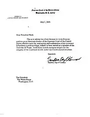 Le , O'Connor annonce sa démission au moment où les commentateurs s'attendaient à la démission du chef William Rehnquist[2]. Celle-ci a pour conséquence de relancer une bataille sur la nomination des juges entre les républicains et les démocrates, affrontement dont la bataille autour de la confirmation des juges conservateurs nommés par le président George W. Bush aux cours d'appel fédérales a été le prélude. Le , le président choisit John G. Roberts, Jr., juge à la cour d'appel fédérale du district de Columbia pour remplacer O'Connor.