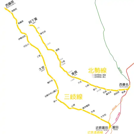 | Ligne Sangi | 三岐線 | Kintetsu-Tomida - Nishi-Fujiwara | 26,5 | 15 |